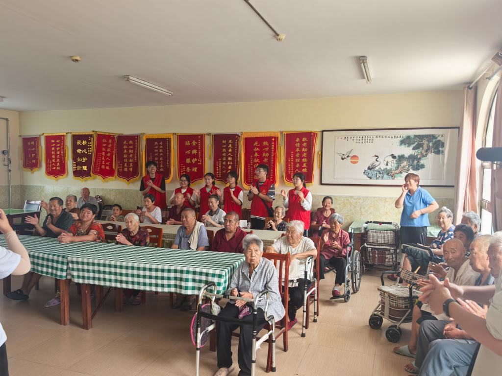 9月3日下午,志愿者们携带提前准备的指甲剪、毛巾、文艺表演道具等物资抵达养老院。在养老院工作人员的引导下,志愿者们迅速分成三组开展服务:生活照料组的同学轻手轻脚走进老人房间,仔细为老人整理床铺、更换干净枕套,将褶皱的被单铺展平整,还耐心询问老人的生活需求,陪老人唠起家常;健康关怀组的同学则围坐在老人身边,一边温柔地为老人修剪指甲,一边讲解日常手部护理小知识,动作轻柔细致,生怕弄疼老人,老人们脸上纷纷露出欣慰的笑容;才艺表演组的同学在养老院活动大厅搭起临时“舞台”,歌曲《我和我的祖国》、《小手拍拍》等节目轮番上演,通俗易懂的表演引发老人阵阵掌声,不少老人还跟着旋律轻轻哼唱,现场氛围温馨融洽。