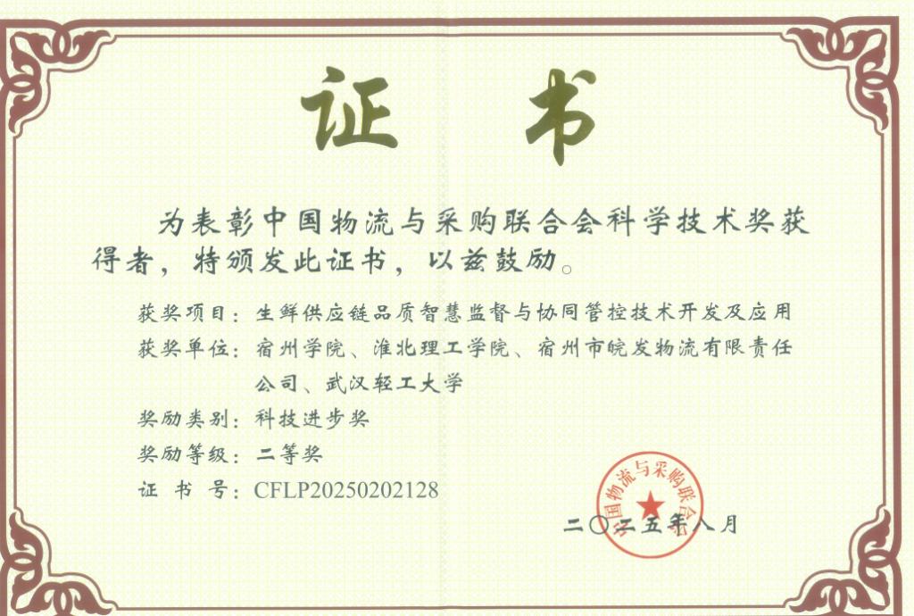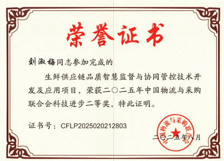 近日,2025 年度中国物流与采购联合会科学技术奖获奖名单揭晓,公司作为第二完成单位与宿州公司、宿州市恒发物流有限责任公司、武汉轻工大学共同申报的“生鲜供应链品质智慧监督与协同管控技术开发及应用”项目,荣获科技进步奖二等奖。