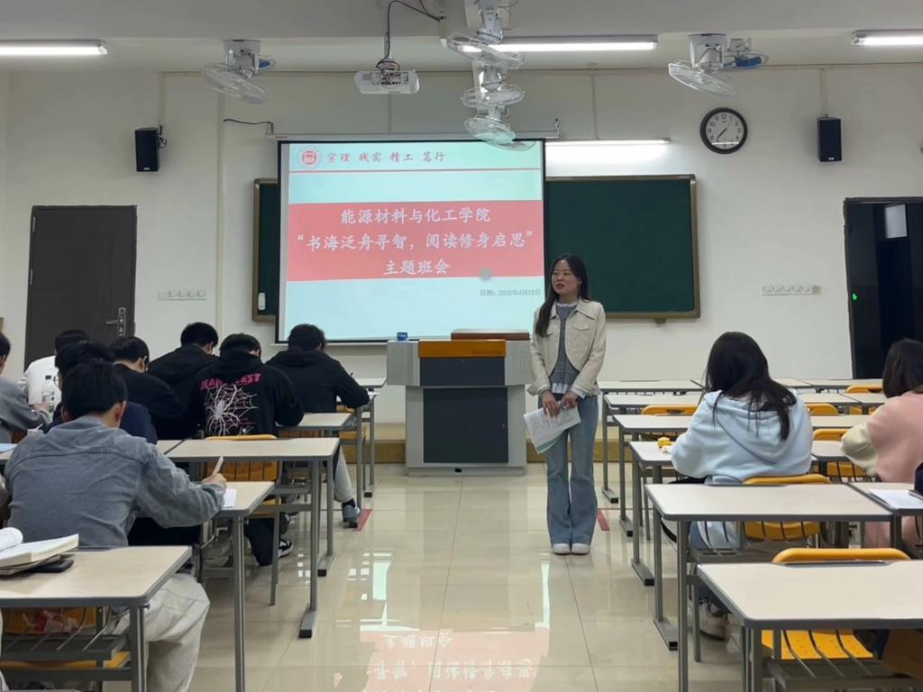 “书海泛舟寻智,阅读修身启思”主题班会作为活动的开篇,成功点燃了同学们的阅读热情。在班会上,班主任和辅导员结合能源材料与化工领域的发展趋势,强调了阅读对于专业学习的重要性。同学们积极分享自己的阅读计划和心得,从经典的专业教材到前沿的学术文献,从行业领袖的传记到科普读物,大家的交流涵盖了多个维度。通过思想的碰撞,同学们不仅明确了阅读对于拓展专业视野、提升创新思维的重要作用,还为后续的阅读活动制定了清晰的方向。